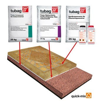 TUBAG – это торговая марка основанная в 1922 году в Германии. Trass – это уникальный природный материал, добываемый в вулканической зоне Восточного Эйфеля, который входит в состав всех продуктов под маркой tubag. Использование природного трасса гарантирует защиту от выцветаний камня и снижает усадку в растворах. Компания tubag предлагает на российском рынке системы мощения природного камня (брусчатки) и тротуарного клинкера.