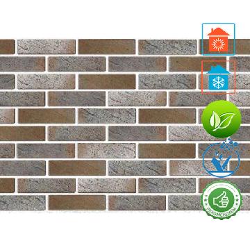 Неповторимый глянцевый медно-серый пестрый цвет и рельефная лицевая поверхность. Производится из смеси красножгущейся глины и песка с торкретированием лицевой поверхности натуральными минеральными компонентами по технологии редукционного-flash обжига.