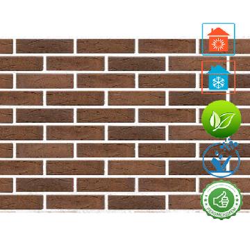 Оригинальный красно-коричневый пестрый цвет и рельефная лицевая поверхность. Производится из смеси красножгущейся глины, песка и тритетраоксида марганца по технологии объемного окрашивания и окислительного обжига.