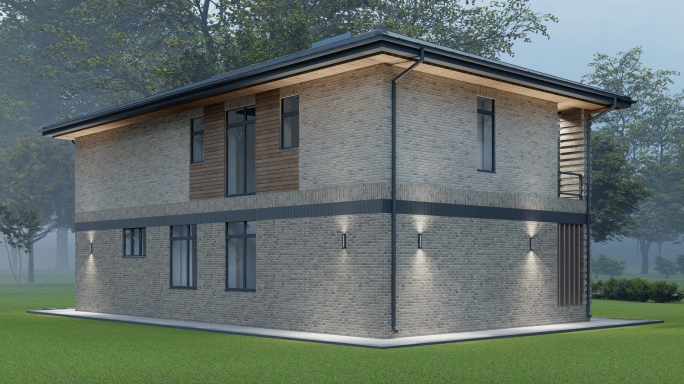 Цоколь выполнен из керамического полнотелого кирпича с наружной облицовкой из керамического кирпича Донские Зори «Серебряно».