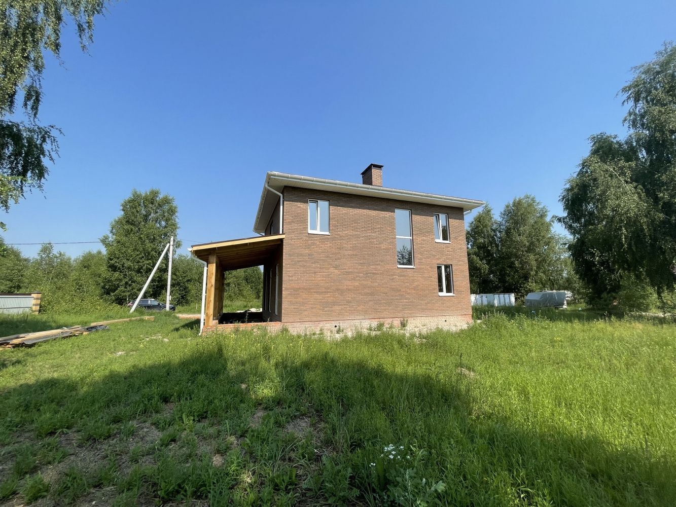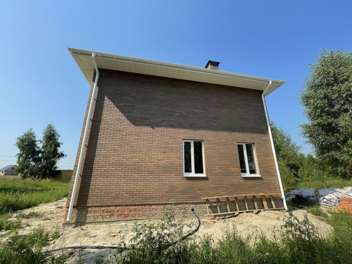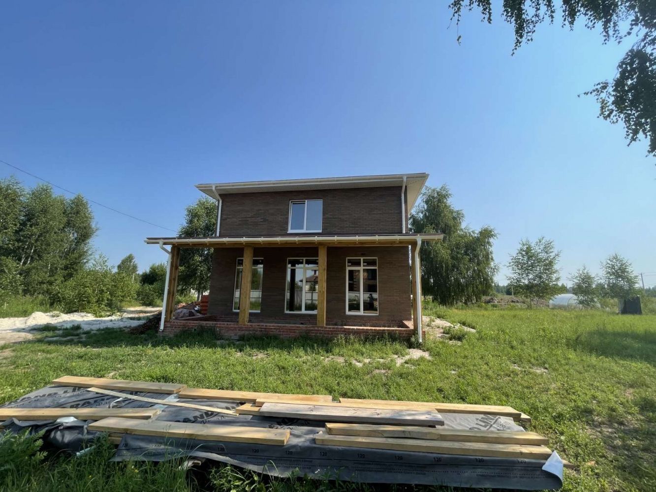 • Над окнами применена система подвесов кирпича BAUT Кровля - металлочерепица Kvinta, производитель - Grand Line, покрытие Velur RAL 7024