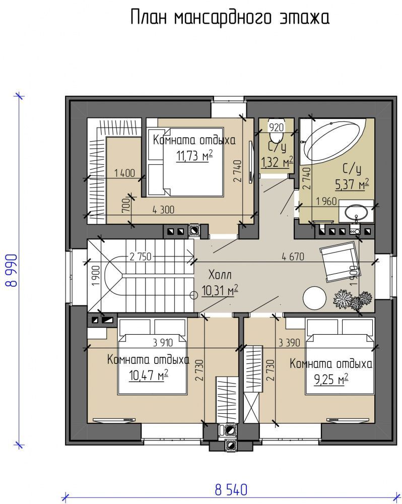 • На мансардном этаже здания размещены: 3 комнаты отдыха, холл и 2 с/у.